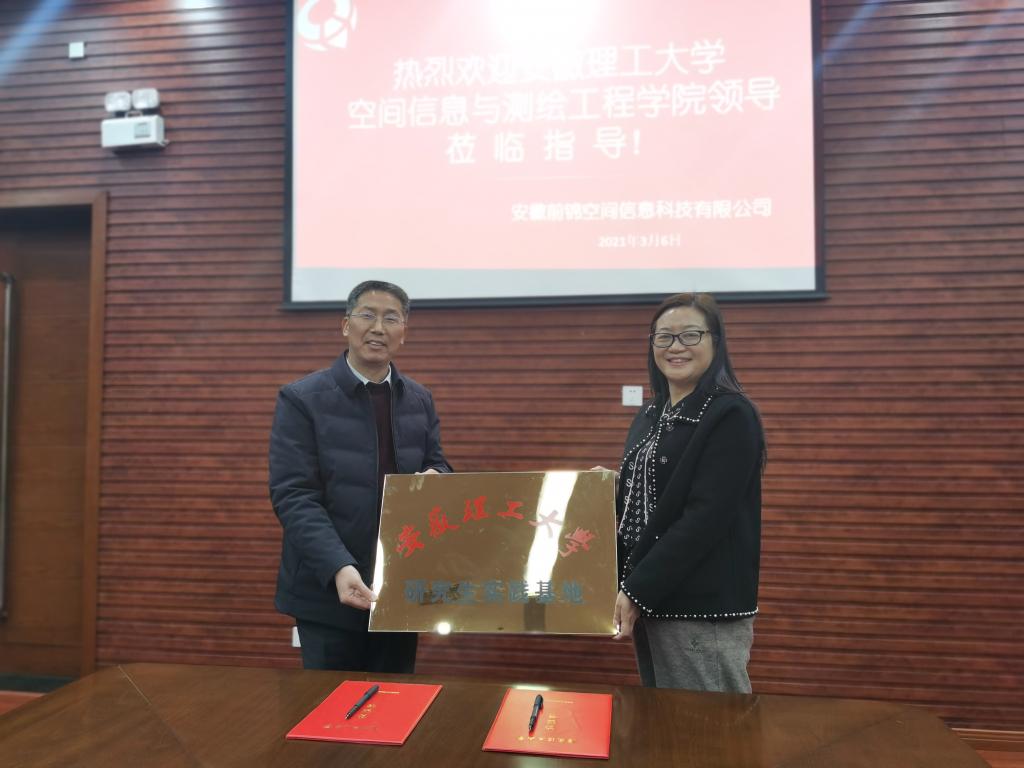 与安徽前锦测绘有限责任公司在合肥举行了共建巨乳av实践基地合作协议签字授牌仪式。院党委书记吴军、院长赵志根、副书记刘瑞、副院长余学祥、副院长王磊和地理信息科学系主任王世航,安徽前锦测绘有限责任公司法人代表盛鸣红及其公司相关部门负责人参加了签字授牌仪式。