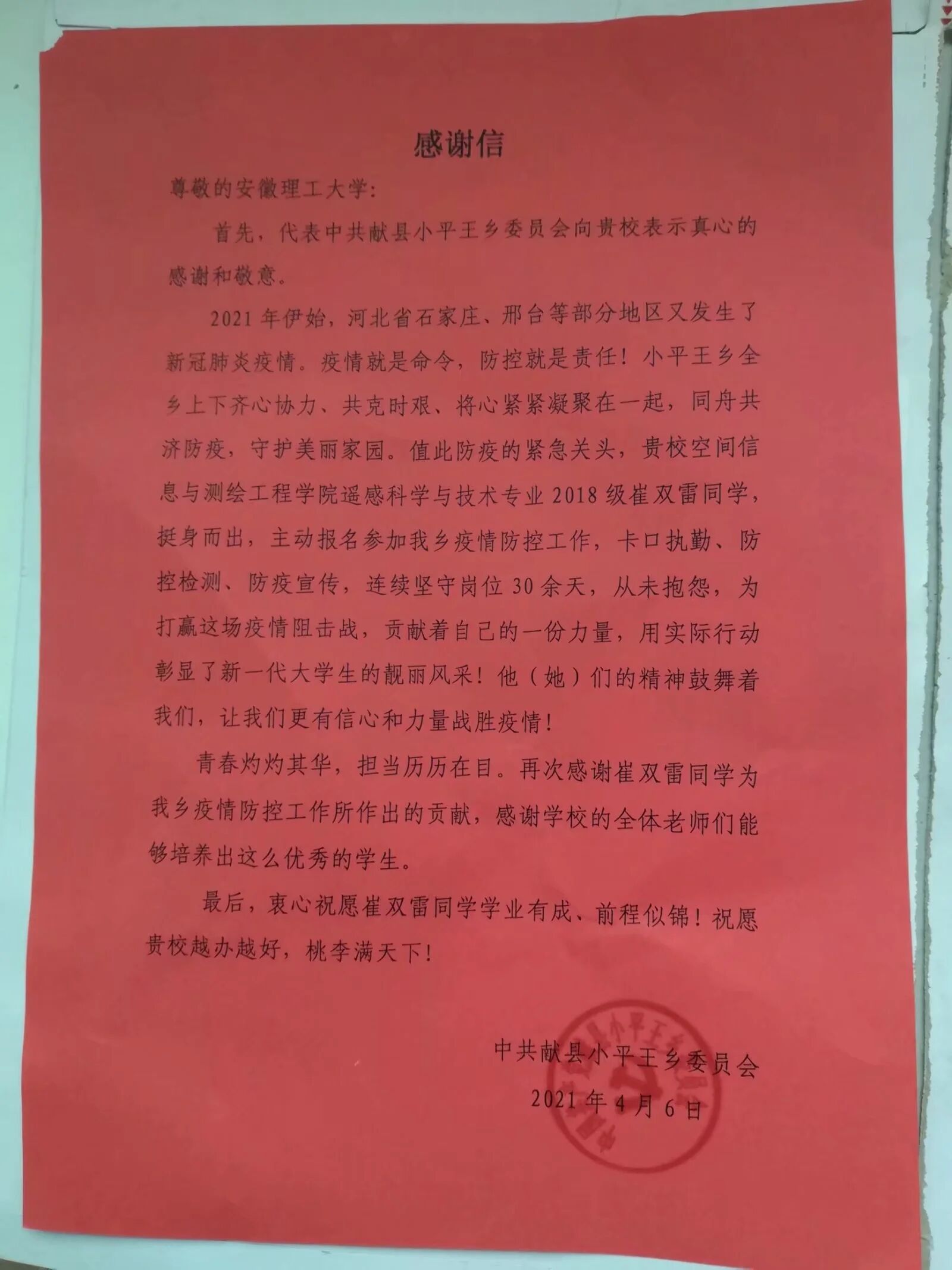 遥感科学与技术2018级1班崔双雷同学的感谢信。