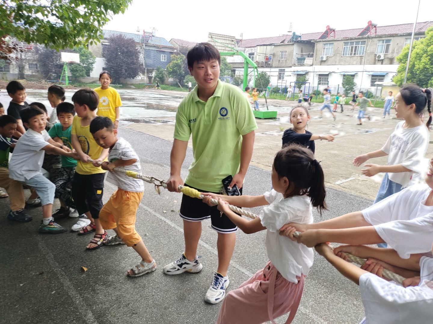 志愿者组织孩子们拔河