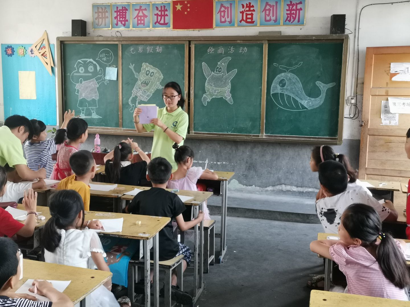 在爱国教育课上,对志愿者带着孩子欣赏祖国大好山河,以启发他们的爱国之心;在环境保护课上,引导孩子们学习尊重、学会爱护自然;在安全教育课上,引导孩子们注意日常生活中的安全隐患和自救方法;队员们还给学生准备了绘画、合唱、朗诵、舞蹈和手语操等多个兴趣课堂。