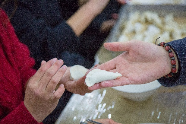 活动伊始,同学们带着期待与兴奋的心情,开始自己动手包饺子。牛肉馅、韭菜肉馅、圆面皮、一双双或笨拙或灵巧的小手和一个个咕噜咕噜叫的肚皮是这场活动最大的主角。同学们或凭经验、或凭想象,捏出不同的造型,经验与“创造力”的碰撞,为活动又平添了几分趣味。在师生们的欢声笑语中,热气腾腾的饺子也从厨房送出,当一盘盘热腾腾的饺子端上桌的时候,看着那圆滚滚、白亮亮、冒着热气的饺子,洋溢在学生心里的是满满的幸福感。每一个饺子都包裹了希望,煮熟了快乐,咬开了幸福,温暖了心窝。