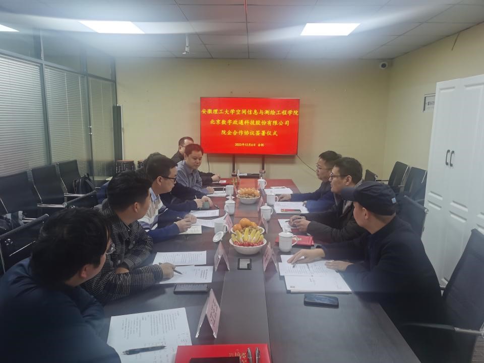 副院长王磊、赵兴旺,地理空间信息工程系、导航工程系负责人等一行4人,赴北京数字政通科技股份有限公司安徽分公司走访调研并签订战略合作协议。北京数字政通科技股份有限公司副总裁肖琦、校企合作部总经理胡威、工程技术中心东南大区总经理李逢华、安徽分公司负责人等出席了会议。