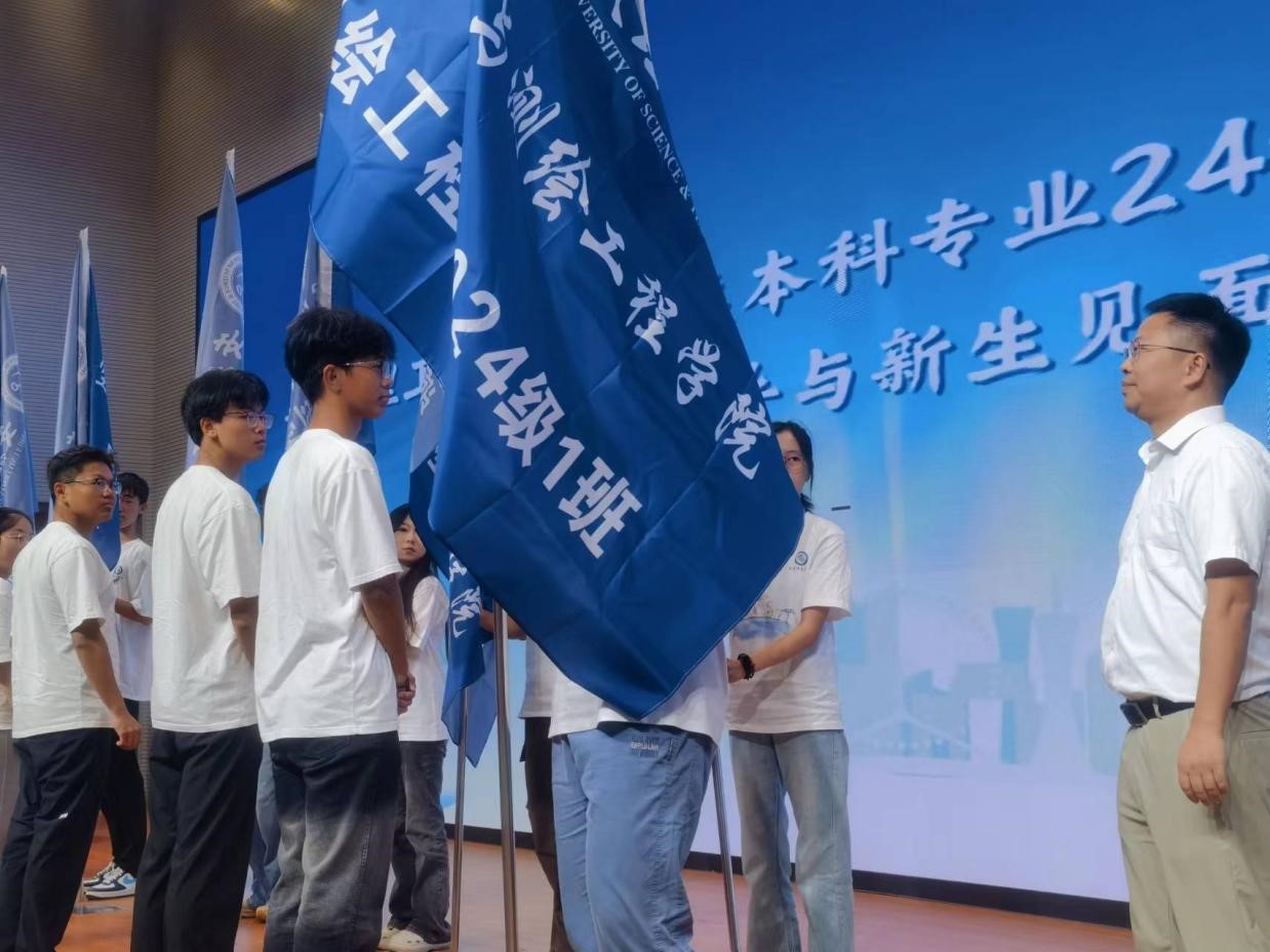 行政负责人王磊为各新生班级授班旗。一面面鲜艳的班旗在会场上飘扬,象征着新生们即将开启的充满希望与活力的大学生活。班旗的传递,不仅是一种仪式,更是一种责任与使命的传承,激励着新生们为班级的荣誉而努力奋斗。