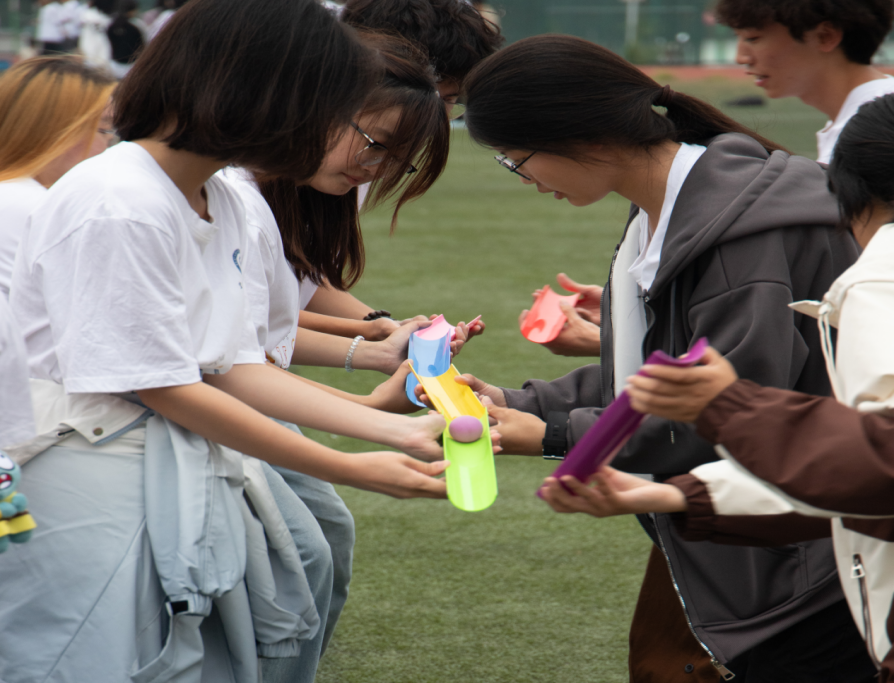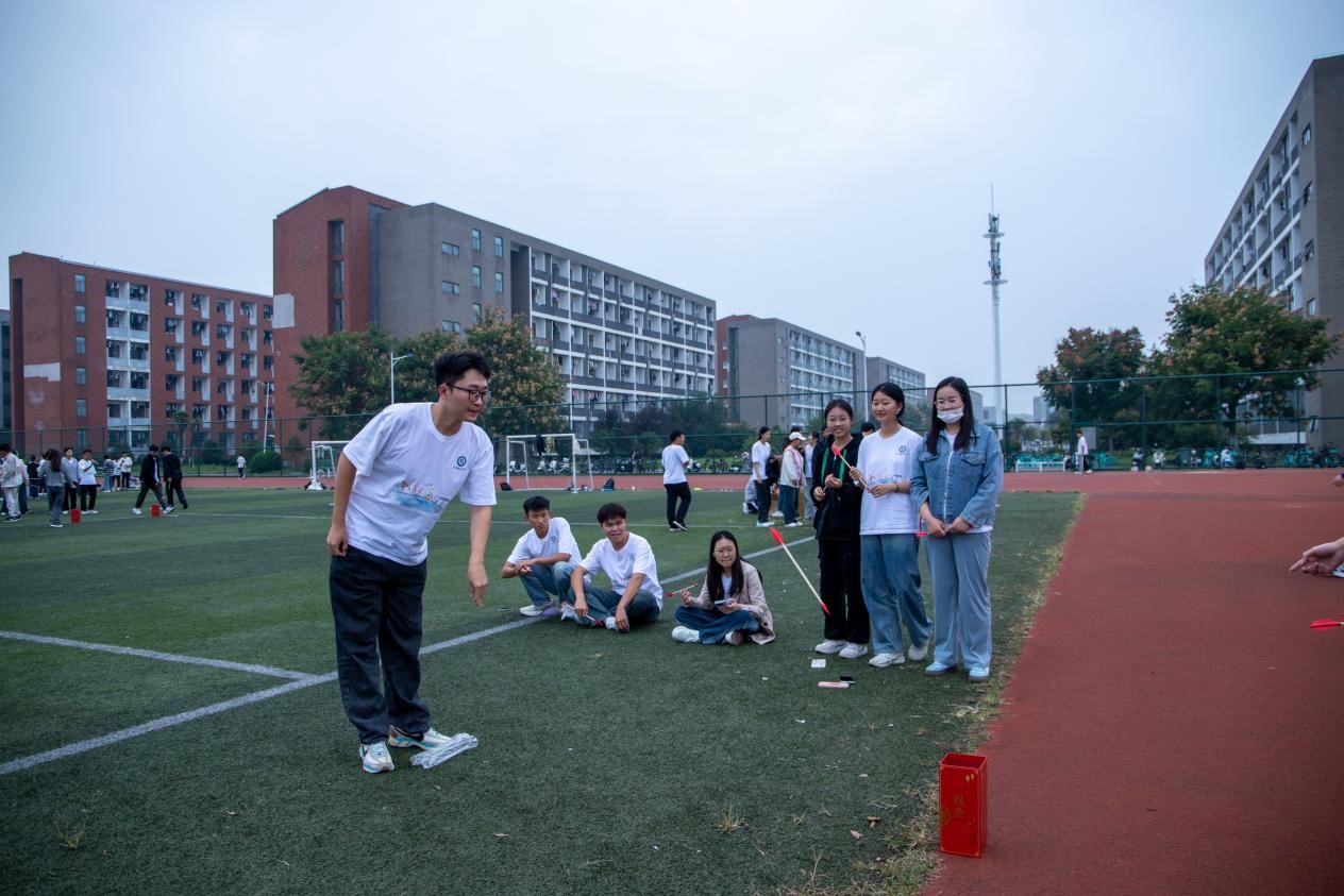 活动开场的破冰行动如同一把神奇的钥匙,瞬间打开了新生之间那扇陌生的门。紧接着的个人自我介绍,更是让每个人都有了展示自我的机会。在这个过程中,新生们不仅认识了更多的伙伴,也让大家对彼此有了初步的了解。随后,精彩的团队活动拉开帷幕。“珠行千里”项目中,同学们一字排开,手持U型槽,个个神情专注。每一次传球都需要高度的默契和精准的操作,大家配合得天衣无缝,小球在U型槽中顺利前行,如同一条流动的光带。而投壶活动现场则充满了传统文化的韵味。新生们站在一定距离外,手中紧握着箭,眼神坚定地瞄准壶口。他们的身姿或挺拔如松,或微微前倾,每个人都全神贯注地计算着角度和力度。投壶区域周围弥漫着紧张而又兴奋的气氛,仿佛时间都在这一刻凝固。